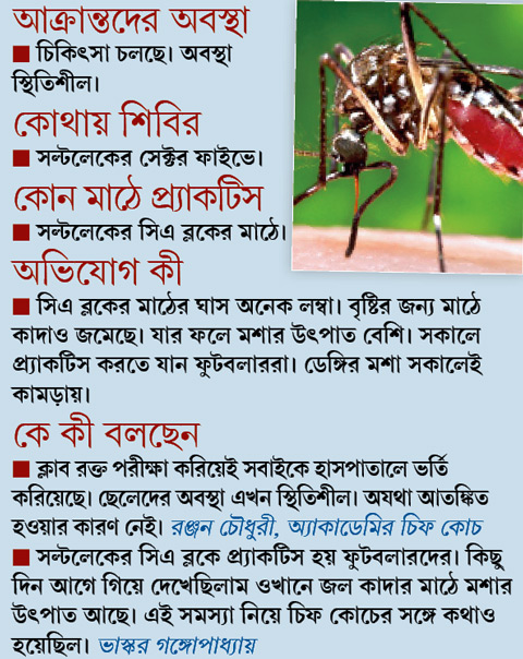 ইস্টবেঙ্গল ক্লাবের ঘরের ছেলে ভাস্কর গঙ্গোপাধ্যায় বলছিলেন, ‘‘সল্টলেকে সিএ ব্লকের মাঠে অনুশীলন হয় ক্লাবের অ্যাকাডেমির। দিন কয়েক আগে গিয়ে দেখেছিলাম জল-কাদার মাঠে মশার উৎপাত বেশি। ওখান থেকেই হয়তো তা ছড়িয়ে পড়তে পারে। বিষয়টা নিয়ে অ্যাকাডেমির চিফ কোচের সঙ্গে আমার কথাও হয়েছিল।’’