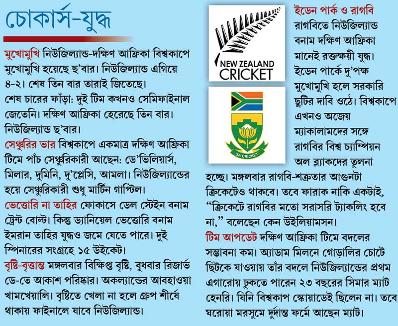 আজকের সেমিফাইনালটা দেশের মাঠে এ বারের বিশ্বকাপে নিউজিল্যান্ডের শেষ ম্যাচ বলে ওরা আরওই বেশি করে জিতে মাঠ ছাড়তে চাইবে। মঙ্গলবার এমন দু’টো দেশের মধ্যে লড়াই যার কেউই বিশ্বকাপে সেমিফাইনালের বাধা ডিঙোতে পারেনি এখনও এবং আজ যে-ই ফাইনালে উঠুক তার পক্ষে সেটা প্রথম বার ঘটবে। আর এমন এক যুদ্ধে অকল্যান্ডের ইডেন পার্কের মাঠ একটা বড় ফ্যাক্টর হবে আমার মতে। মাঠটার বাউন্ডারি বেশ ছোট যেখানে দু’দলের অন্তত হাফজডন এমন বিগহিটার আছে যাদের ব্যাট আজ চললে হয়তো আরও একটা রেকর্ড স্কোর দেখা যাবে ম্যাচে। যেমন ম্যাকালাম, গাপ্টিল, ডে’ভিলিয়ার্স, আমলা, কোরি অ্যান্ডারসন, দুপ্লেসি!