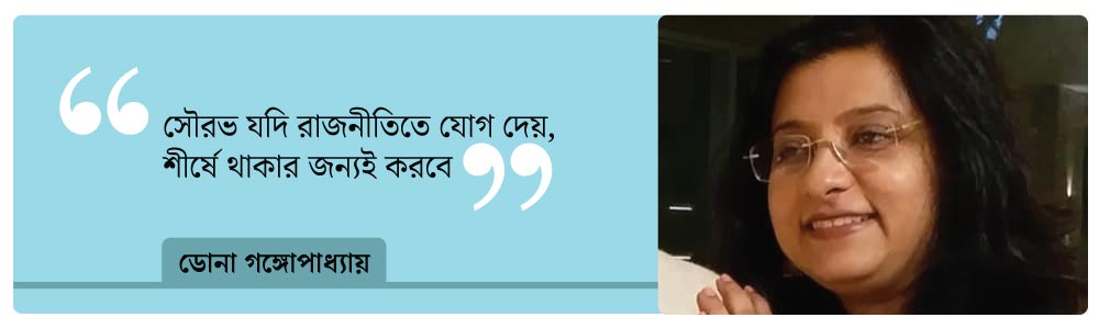 আনন্দবাজার ডিজিটালকে ডোনা সরাসরি বললেন, “এখনও সৌরভ কোনও সিদ্ধান্ত নিয়েছে বলে আমার জানা নেই। কিন্তু ও যে পিচেই খেলুক না কেন, তাতেই সেরা হয়। হয়তো স্বাভাবিক অবস্থা থেকে শুরু করে, কিন্তু ঠিক শীর্ষে পৌঁছয়। যদি রাজনীতিতে যোগ দেয়, তা হলে আশা করছি হি উইল ফিনিশ দ্য টপ।” যা যথেষ্ট ইঙ্গিতবাহী।