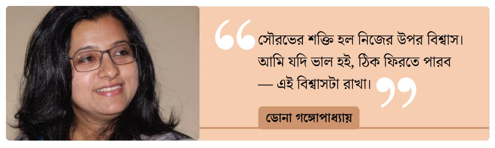 সৌরভ মানেই কামব্যাক ম্যান। ছিটকে গিয়েও ফিরে আসা। যাবতীয় প্রতিকূলতা অগ্রাহ্য করে, হার-না-মানা জেদ সঙ্গী করে, স্রোতের বিরুদ্ধে সাঁতার কেটে। এই মানসিক জোরের উৎস কী? ডোনা বললেন, “নিজের উপর বিশ্বাস। আমি যদি ভাল হই, ঠিক ফিরতে পারব— এই বিশ্বাসটা রাখা। আমাকে ভুল কারণে ব্রাত্য করে রেখেছে, আমি আবার ফেরত যাব। এটাই মারাত্মক শক্তি। গ্রেগ চ্যাপেল যখন বাদ দিল, তখন ও দেশের সেরা ক্যাপ্টেন। আন্তর্জাতিক ক্রিকেটে প্রচুর রান করে ফেলেছে। যদি আর দেশের হয়ে না-ও খেলত, তা হলেও খুব তফাত হত না।”