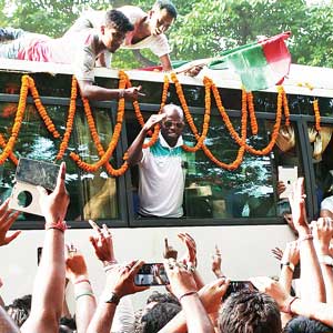 সমর্থকদের স্যালুট বেলোর। সোমবার। ছবি উৎপল সরকার।
