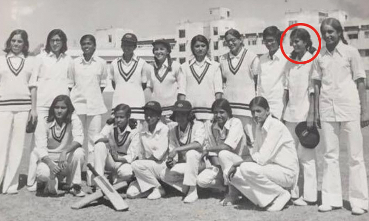 ১৯৭৫ সালে পুণের নেহরু স্টেডিয়ামে ভারতীয় মহিলা ক্রিকেট দলে শ্রীরূপা বসু মুখোপাধ্যায় (ডানদিক থেকে দাঁড়িয়ে দ্বিতীয়)। ছবি: ফেসবুক।