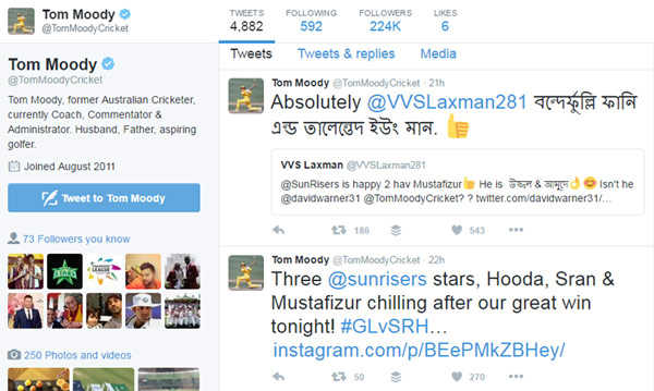 অনুবাদ করে আবার টুইটও করেছেন কোচ টম মুডি। সেই টুইটে জবাবও দিয়েছেন মেন্টর লক্ষ্মণ। মুডি ইংরেজিটাই বাংলা হরফে লিখে টুইট করেছেন। লিখতে চেয়েছিলেন ‘ওয়ান্ডারফুল ফানি এন্ড ট্যালেন্টেড ইয়ং ম্যান’। কিন্তু সেটা গুগলের বদান্যতায় হয়ে গেছে অন্য রকম। লক্ষ্মণ অবশ্য তার সঠিক বাংলা করেছেন। জবাব দিয়ে লিখেছেন, ‘হি ইজ উজ্জ্বল ও আমুদে।’ তিনি লিখেছেন, ‘মুস্তাফিজকে পেয়ে সানরাইজার্স আনন্দিত।’ অধিনায়ক ডেভিড মিলার আবার টুইট করেছেন, ‘ফিজের জন্য আমি গুগল ট্রান্সলেটর ব্যবহার করছি। বাংলা শেখার চেষ্টা করছি।’ এক কথায় দলের একমাত্র বাঙালিকে নিয়ে উচ্ছ্বসিত পুরো দল।