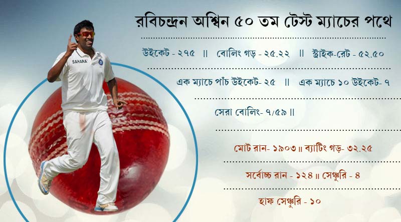 জীবনের ৫০তম টেস্ট ম্যাচটি খেলতে চলেছেন রবিচন্দ্রন অশ্বিন। বুধবার গলে শ্রীলঙ্কার বিরুদ্ধে এই সিরিজের প্রথম টেস্ট ম্যাচ খেলতে নামছে ভারত। আর সেটাই হতে চলেছে দেশের সেরা বোলারের টেস্ট ম্যাচের হাফ সেঞ্চুরি। দীর্ঘদিন এক নম্বরে থাকার পর এ বার সেই জায়গা তিনি ছেড়ে দিয়েছেন সতীর্থ রবীন্দ্র জাডেজার জন্য। দ্বিতীয় স্থানে থাকলেও সদ্য সেই জায়গা ছেড়ে দিতে হয়েছে রঙ্গনা হেরাথকে। নেমে গিয়েছেন তিন নম্বরে। তা বলে তাঁর কৃতিত্ব কোথায় কমেনি। বরং ভারতীয় বোলিং ডিপার্টমেন্টের তিনিই বড় ভরসা। সেই রবিচন্দ্রন অশ্বিন বুধবার খেলতে নামছেন তাঁর ৫০তম টেস্ট। তার আগে একঝলকে দেখে নেওয়া যাক অশ্বিনের সেরা কিছু ইনিংস।