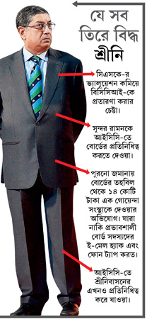 শ্রীনির বিরুদ্ধে অভিযোগ একাধিক। সবচেয়ে চাঞ্চল্যকর অভিযোগ দু’টো। এক, সিএসকের ট্রান্সফার মাত্র পাঁচ লক্ষ টাকায় করানোর অপচেষ্টা। রোববারের ওয়ার্কিং কমিটিতে বিশেষ আমন্ত্রিত কোনও কোনও সদস্য মনে করেন, বোর্ডকে প্রতারণার দায়ে শ্রীনি এবং আইপিএল সিওও সুন্দর রামন দু’জনকেই এখুনি সাসপেন্ড করা উচিত। তাঁদের মতে, ইন্ডিয়া সিমেন্টসের ব্যালান্স শিটে সিএসকের এখনকার ব্র্যান্ড ভ্যালু দেখানো হয়েছে ছ’শো কোটি টাকা। তা হলে তাকে পাঁচ লক্ষ টাকা বলে চালানো হবে কেন? অর্থাৎ বোর্ডকে তিরিশ কোটি টাকা ফাঁকি দেওয়ার চেষ্টা। এ জন্য শুধু শ্রীনি নন, ওয়ার্কিং কমিটি চাইলে ব্যবস্থা নিতে পারে প্রাক্তন আইপিএল চেয়ারম্যান রঞ্জীব বিসওয়ালের বিরুদ্ধেও। যিনি শেষ কাউন্সিল বৈঠকে এটাকে পাশ করিয়ে দেওয়ার উপক্রম করেছিলেন। ওয়ার্কিং কমিটিতে আরও প্রশ্ন উঠতে পারে সুন্দর রামনকে কেন আইসিসিতে বোর্ডের প্রতিনিধিত্ব করতে দেওয়া হচ্ছে? এক জন বোর্ড সদস্য বলছিলেন, তিরিশ জন বোর্ড সদস্যের মধ্যে আইসিসিতে প্রতিনিধিত্ব করার কি এক জনও নেই যে বোর্ডের একজন চাকুরিজীবীকে পাঠাতে হবে? কেউ কেউ আরও তীব্র কৌতুকে বলছেন, সুন্দর রামন কোন কমিটিতে আছেন গুগলে গিয়ে দেখুন। ও আছে আইসিসির দুর্নীতিদমন সাব-কমিটিতে! সুন্দর কি না দুর্নীতিদমন কমিটির সদস্য! এটা তো বছরের সেরা রসিকতা।
