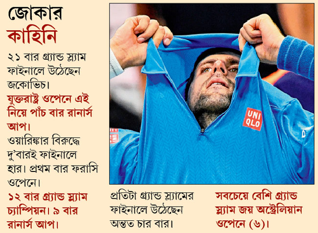 টিভিতে দেখতে দেখতে ভাবছিলাম, এই লোকটা আর দু’দিন আগেই সেমিফাইনালে যে লোকটা বিপক্ষের সময় নষ্টের চেষ্টা দেখে রাগে নিজের শার্ট ছিঁড়ে ফেলেছিল, তারা এক-ই কি না? তার পর মনে হল, সেই ম্যাচে মঁফিসের কোর্টের মধ্যে সময় নষ্টের কারণে হয়তো মেজাজ হারিয়েছিল জকোভিচ। এ দিনের মতো ন্যায্য কারণে সময় নষ্টের ব্যাপার ঘটলে নিশ্চয়ই মেনে নিত।
