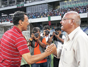 ম্যাচের আগে এবং পরে দু’বার হাত মেলালেন। দু’বারই মোহনবাগান রিজার্ভ বেঞ্চের দিকে এগিয়ে যান সুব্রত। সুভাষ আবার একটা চাটির মতো ‘ভালবাসার মোড়কে’ সুব্রতর মাথায় টোকা মারলেন খেলা শেষে। সাংবাদিক সম্মেলনে এসেও দু’জনেই একে অপরের প্রশংসায় পঞ্চমুখ। এমনকী সুব্রত যখন বলছেন, “এই মোহনবাগানে অন্তত চার-পাঁচ জন ফুটবলার বদলাতে হবে। না হলে কিছুই হবে না,’ তখনও সুভাষ সংযমী--“উনি ওনার কথা বলেছেন।”