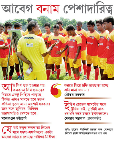সুভাষ বিনয়ী হতে পারেন। কিন্তু রঘু নন্দী হতে যাবেন কোন দুঃখে! টানা পঁয়ত্রিশ ম্যাচ অপরাজিত ছিলেন টালিগঞ্জ অগ্রগামী কোচ হিসাবে। হঠাৎ-ই তাঁর সাজানো বাগানে ঢুকে পড়েছেন ‘মোহনবাগানের ঘরের ছেলে’ এবং প্রথম ম্যাচেই হেরেছেন। ময়দানের ‘জায়ান্ট কিলার’ হিসেবে স্বীকৃত রঘুর গলা তাই আরও তীক্ষ্ম। “সুব্রত ভট্টাচার্য কীসের বড় কোচ? কোকো-বিদেমির মতো দু’জন পজিটিভ বিদেশি স্ট্রাইকার হাতে থাকতে ন’জন নিয়ে ডিফেন্স করে গেল? এক পয়েন্টের খেলা খেলতে গিয়ে তিন পয়েন্ট দিয়ে এল! আরে, ওই দু’জনকে সামনে রাখলেই জিতত টালিগঞ্জ। আমি থাকলে কিন্তু মোগনবাগানকে হারাতাম।” টিভিতে খেলা দেখে বলছিলেন সদ্য প্রাক্তন টালি-কোচ।
