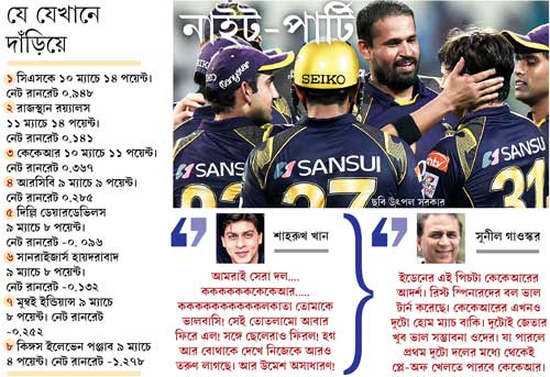 ম্যাচ দশ, পয়েন্ট এগারো, হাতে চার, যার তিনটে হলেই চলবে। মানে, পড়ে থাকা চার ম্যাচের তিনটে জেতা গেলে প্লে-অফ টিকিট নিশ্চিত। শুরু তখন আবার স্বপ্ন দেখা। কলকাতার বুকে আবার ফাইনালের হৃদস্পন্দন। বেঙ্গালুরু বা চেন্নাই নয়, ফাইনাল যে কলকাতায়। কলকাতার ইডেনে।