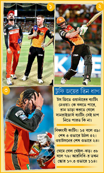 আবার বেঙ্গালুরু দর্শককে দেখুন। শেষ ওভারে আঠারো চাই, এ তো টি-টোয়েন্টি বিশ্বকাপ ফাইনালেই উঠতে দেখেছে ক্রিকেটবিশ্ব। কোনও এক কার্লোস ব্রেথওয়েটকে তো তুলতে দেখেছে। কিন্তু বেঙ্গালুরু জনতা নিজ-ভাষায়, বহিঃপ্রকাশে ক্রমাগত বুঝিয়ে গেল যে, আজ আর হবে না। নিস্পন্দ থেকে। নিশ্চুপ হয়ে গিয়ে। বাস্তবকে মেনে নিয়ে যে, রূপকথা আইপিএল ফাইনাল ভাগ্যে নেই। রূপকথার অপমৃত্যুর দিন আজ। চোখের জল ফেলতে হবে, ফেলে বরণ করে নিতে হবে ডেভিড ওয়ার্নার নামক এক অস্ট্রেলীয় যোদ্ধাকে। দেখতে হবে ট্রফি নিয়ে তাঁদের উল্লাস।