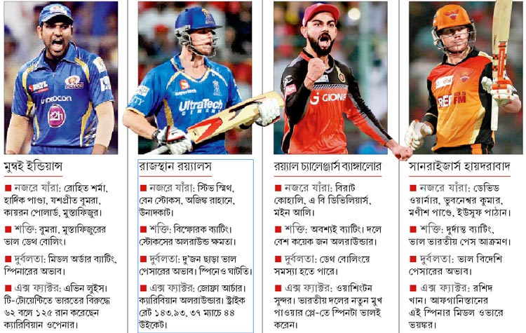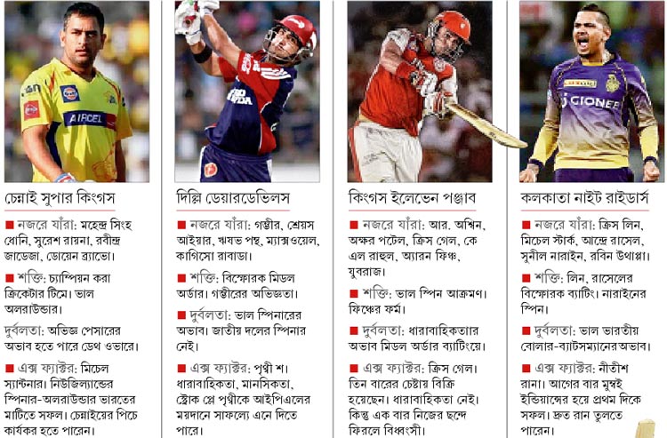 কাগজে কলমে আটটা দলের মধ্যে সানরাইজার্স হায়দরাবাদ, দিল্লি ডেয়ারডেভিলস, চেন্নাই সুপার কিংগস এবং রয়্যাল চ্যালেঞ্জার্স ব্যাঙ্গালোর-কে আমি উপরের দিকে রাখব। এরাই এ বারের ফেভারিট। এই চারটে টিমের বিশেষত্ব হল, ওরা নিজেদের কোর গ্রুপটা ধরে রেখে তার সঙ্গে বাড়তি শক্তি যোগ করেছে।