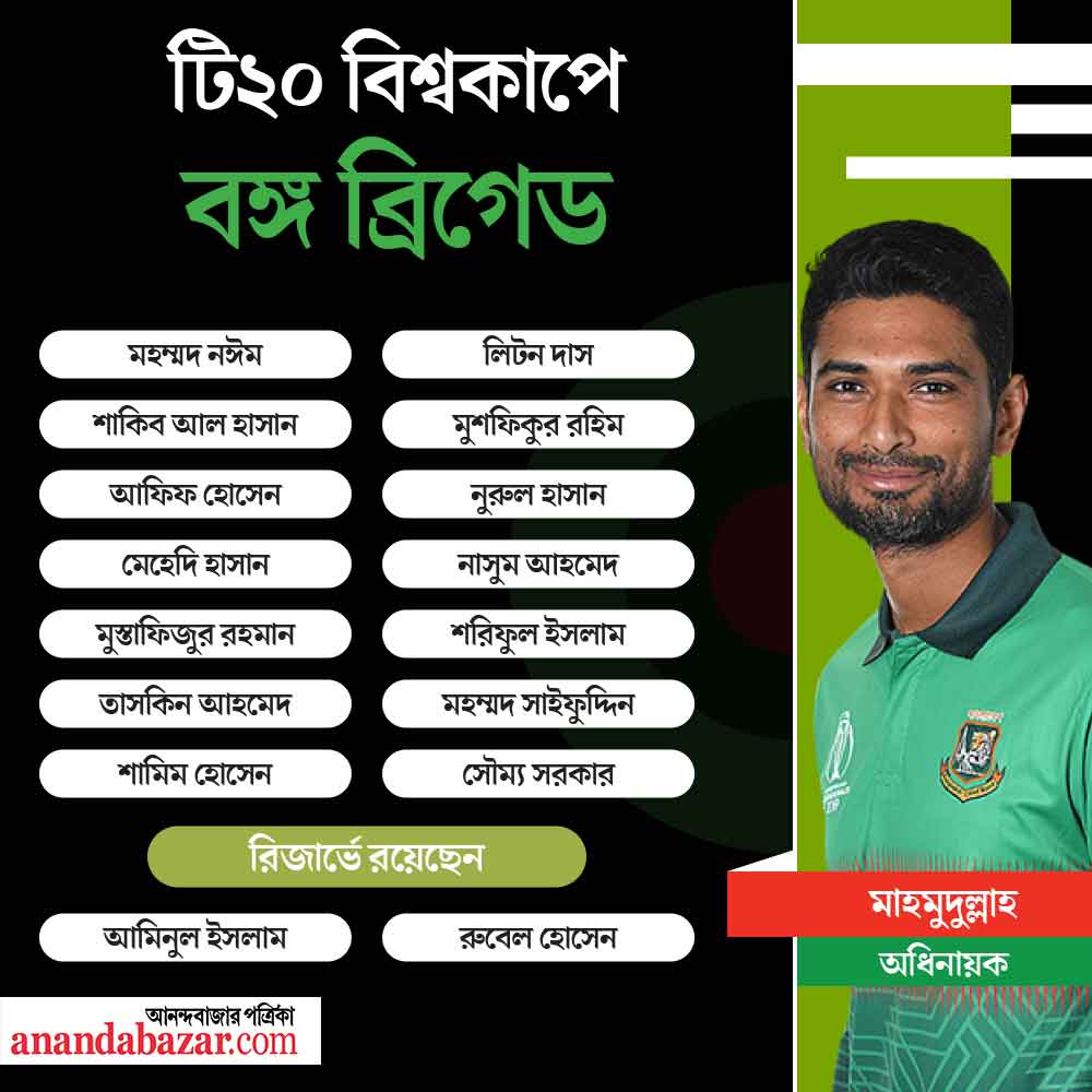 টি-টোয়েন্টি বিশ্বকাপের জন্য ১৫ জনের দল ঘোষণা করল বাংলাদেশ। দু’জনকে রাখল রিজার্ভ ক্রিকেটার হিসেবে। বিশ্বকাপে অধিনায়ক থাকছেন মাহমুদুল্লাহ। শাকিব আল হাসানদের প্রথমে যোগ্যতা অর্জন পর্বে খেলতে হবে। সেখান থেকে জিতে ১২ দলের মূল পর্বে আসতে হবে তাঁদের।