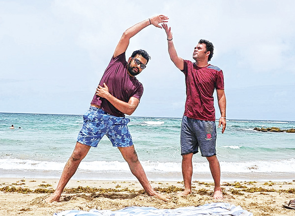 সেন্ট নেভিসের সৈকতে রোহিত শর্মার যোগাভ্যাস। ছবি: টুইটার