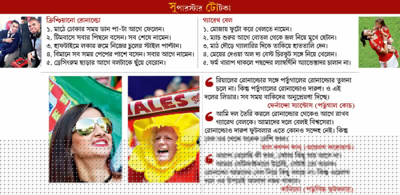 পর্তুগালকে বরং খানিকটা ‘ওয়ান-ম্যান টিম’ দেখাচ্ছে। তবে ওদের মাঝমাঠে স্যাঞ্চেজের মতো নজরকাড়া ফুটবলার থাকবে। এই টুর্নামেন্টে ওরা গোটাকয়েক ম্যাচ কোনওক্রমে জিতেছে, যেগুলো ওদের সহজে জেতা উচিত ছিল। পর্তুগাল ফুটবলারদের হঠাৎ হঠাৎ পেটের ভেতর গুড়গুড়ুনি ওঠা, যেটা মাঠে বোঝাও যায়। আর তার ফলে ওদের ভুলভাল করে ফেলার ফায়দা যদি প্রতিজ্ঞাবদ্ধ এবং সংঘবদ্ধ ওয়েলস টিম তুলতে পারে, তা হলে কিন্তু রোনাল্ডোদের কপালে দুঃখ আছে।