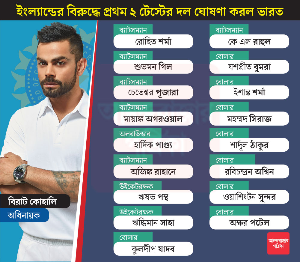 অস্ট্রেলিয়ার বিরুদ্ধে ঐতিহাসিক টেস্ট সিরিজ জয়ের দিনেই ঘরের মাঠে আসন্ন ইংল্যান্ড সিরিজের জন্য প্রথম দু ম্যাচের দল ঘোষণা করে দিল বিসিসিআই। এই দুটি ম্যাচই হবে চেন্নাইতে। ১৮ জনের দলে ডাক পেয়েছেন হার্দিক পাণ্ড্য, অক্ষর প্যাটেল। দলে ফিরছেন অধিনায়ক বিরাট কোহালি। স্ট্যান্ডবাই হিসেবে দলে জায়গা পেয়েছেন বাংলার অভিমন্যু ঈশ্বরণও।