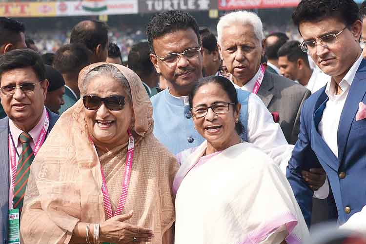 ভারতের মাটিতে প্রথম গোলাপি বল টেস্টের উদ্বোধনে বাংলাদেশের প্রধানমন্ত্রী শেখ হাসিনার সঙ্গে মুখ্যমন্ত্রী মমতা বন্দ্যোপাধ্যায়, বিসিসিআই প্রেসিডেন্ট সৌরভ গঙ্গোপাধ্যায় এবং কলকাতার মেয়র ফিরহাদ হাকিম। শুক্রবার ইডেনে । ছবি: দেশকল্যাণ চৌধুরী