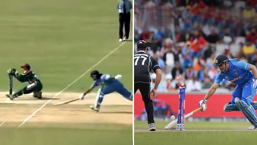 (বাঁ দিকে) চট্টগ্রামের সেই রান আউট। গাপ্তিলের রকেট থ্রোয়ে রান আউট ধোনি।
