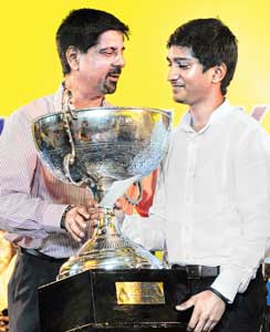 ও পাঁচ হাজার টাকার চেক তুলে দিচ্ছেন কৃষ্ণমাচারি শ্রীকান্ত। শনিবার সিএবিতে।