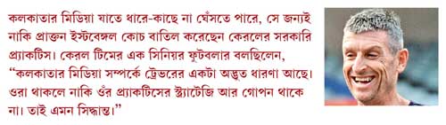 আইএসএলের স্থানীয় কর্তাদের যদিও দাবি “আমাদের কাছে ওরা প্র্যাকটিস মাঠ চায়নি। তাই ব্যবস্থাও করা হয়নি।” তবে কোচিতে খোঁজ নিয়ে জানা গেল, কলকাতার মিডিয়া যাতে ধারে-কাছে ঘেঁসতে না পারে, সে জন্যই নাকি প্রাক্তন ইস্টবেঙ্গল কোচ বাতিল করেছেন কেরলের সরকারি প্র্যাকটিস। কেরল টিমের এক সিনিয়র ফুটবলার বলছিলেন, “কলকাতার মিডিয়া সম্পর্কে ট্রেভরের একটা অদ্ভুত ধারণা আছে। ওরা থাকলে নাকি ওঁর প্র্যাকটিসের স্ট্র্যাটেজি আর গোপন থাকে না। তাই এমন সিদ্ধান্ত।”