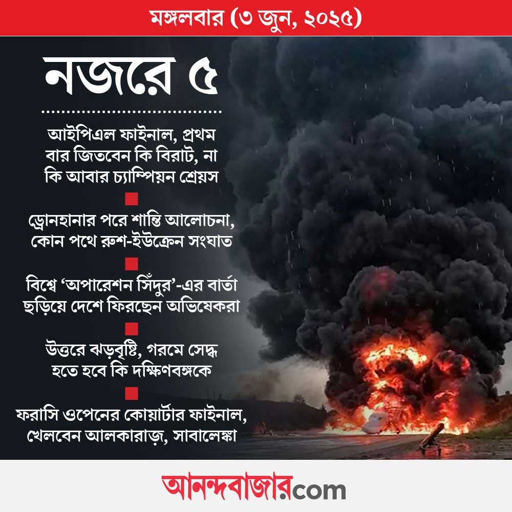 রাশিয়ায় ইউক্রেনের ড্রোন হানার পরে সোমবারই শান্তি আলোচনায় বসে দুই দেশ। তুরস্কের ইস্তানবুলে এক ঘণ্টার কিছু বেশি সময় ধরে ওই বৈঠক হয়। দু’পক্ষেরই যুদ্ধবন্দিদের মুক্তির বিষয়ে ওই বৈঠকে আলোচনা হয়ে থাকতে পারে। ইউক্রেনের প্রেসিডেন্ট ভলোদিমির জ়েলেনস্কি জানিয়েছেন, যুদ্ধবন্দির মুক্তির বিষয়ে প্রস্তুতি নিচ্ছে ইউক্রেন। বস্তুত, যুদ্ধ থামানোর জন্য জন্য বন্দিমুক্তির পাশাপাশি ‘নিঃশর্ত’ যুদ্ধবিরতির জন্য আগে থেকেই সরব ইউক্রেন। তবে ইউক্রেনের উপ বিদেশমন্ত্রী জানিয়েছেন, রাশিয়া ধারাবাহিক ভাবে নিঃশর্ত যুদ্ধবিরতির প্রস্তাব উড়িয়ে দিচ্ছে। এই অবস্থায় রুশ-ইউক্রেন সংঘাতের পরিস্থিতি কোন দিকে যায়, ইউক্রেনের ড্রোনহানার পরে রাশিয়াও বড়সড় কোনও প্রত্যাঘাত করে কি না, সে দিকে নজর থাকবে আজ।