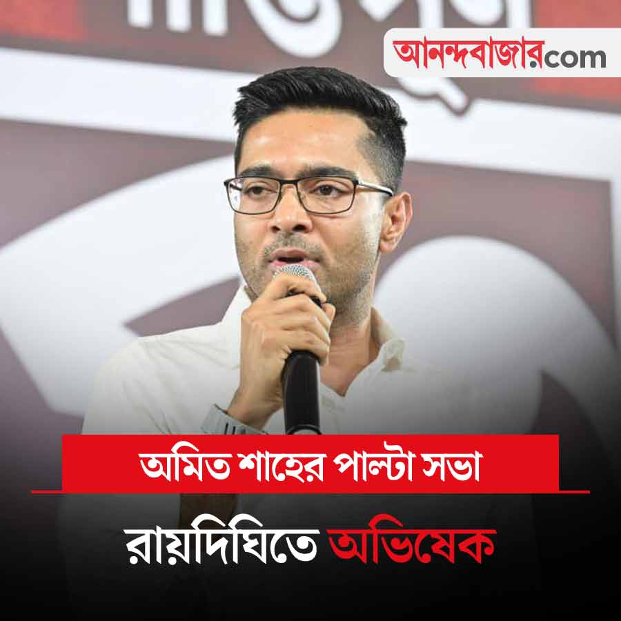 কেন্দ্রীয় স্বরাষ্ট্রমন্ত্রী অমিত শাহ যেখানে সভা করেছেন, সেই মাঠেই এ বার পাল্টা সভা করতে চলেছেন তৃণমূলের সর্বভারতীয় সাধারণ সম্পাদক অভিষেক বন্দ্যোপাধ্যায়। দক্ষিণ ২৪ পরগনার মথুরাপুর সাংগঠনিক জেলায় রায়দিঘির একটি মাঠে গত সোমবার শাহের সভা হয়। ওই একই মাঠে আজ সভা করার সিদ্ধান্ত নিয়েছেন অভিষেক। এই সভার দিকে নজর থাকবে।