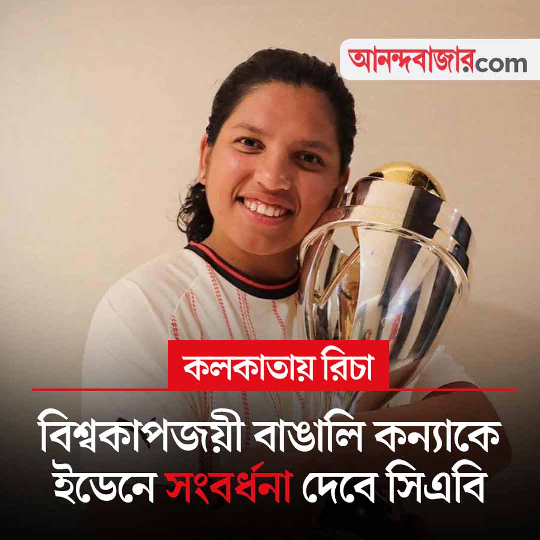 আজ কলকাতায় বিশ্বকাপজয়ী রিচা ঘোষের সংবর্ধনা। সিএবি এই সংবর্ধনা দেবে। পুরুষ-মহিলা মিলিয়ে রিচাই একমাত্র বাঙালি ক্রিকেটার, যিনি বিশ্বকাপ জিতেছেন। ইডেনে তাঁকে সংবর্ধনা দেবে বাংলার ক্রিকেট নিয়ামক সংস্থা। অনুষ্ঠান শুরু বিকেল ৫টা থেকে।