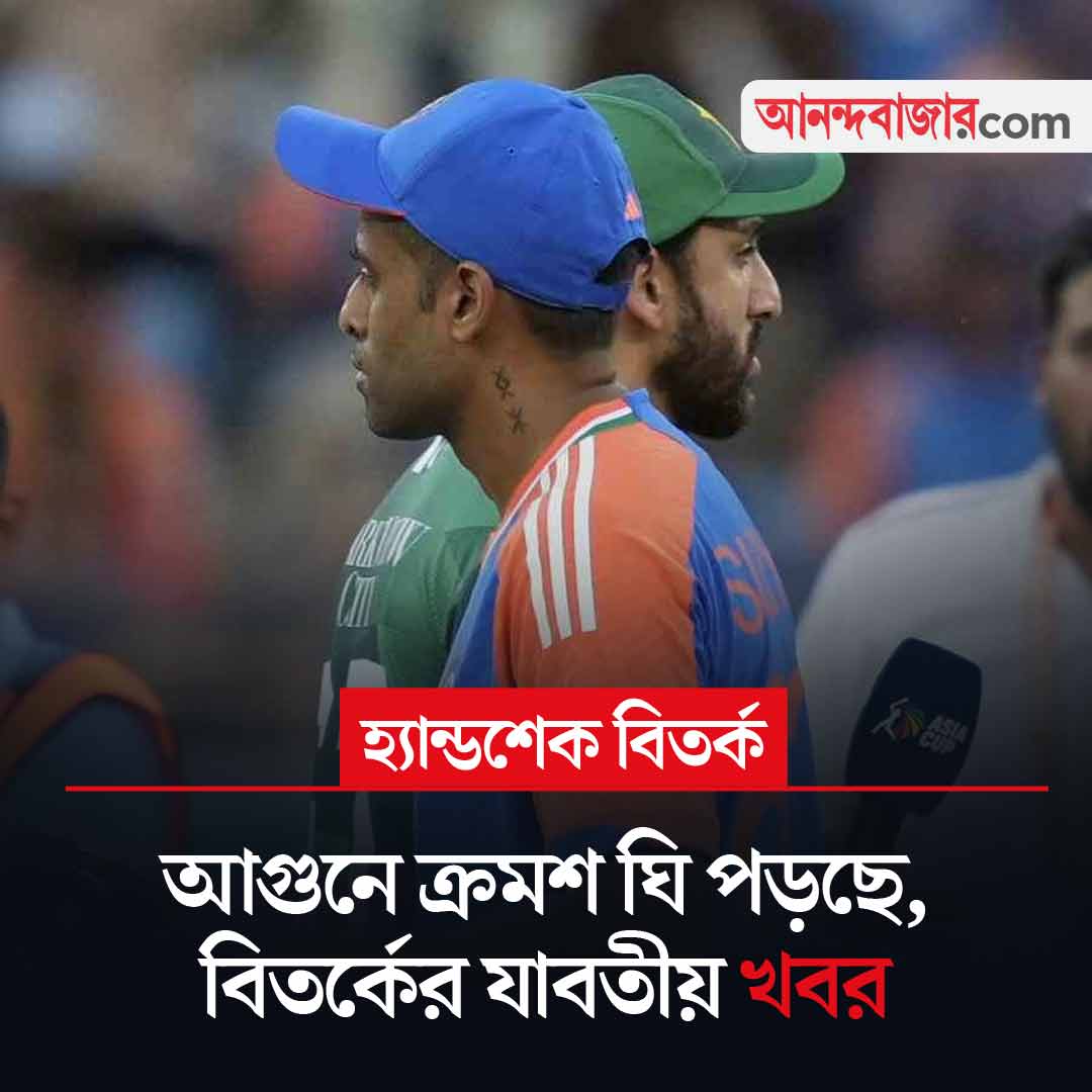 এশিয়া কাপে হ্যান্ডশেক বিতর্ক থামার নাম নেই। রবিবার ম্যাচের পর পাকিস্তানের ক্রিকেটারদের সঙ্গে হাত মেলাননি ভারতীয় ক্রিকেটারেরা। তার পর থেকে দাবি, পাল্টা দাবি, হুমকি, পাল্টা হুমকি চলছেই। এই বিতর্ক সহজে মেটার নয়। সব খবর।