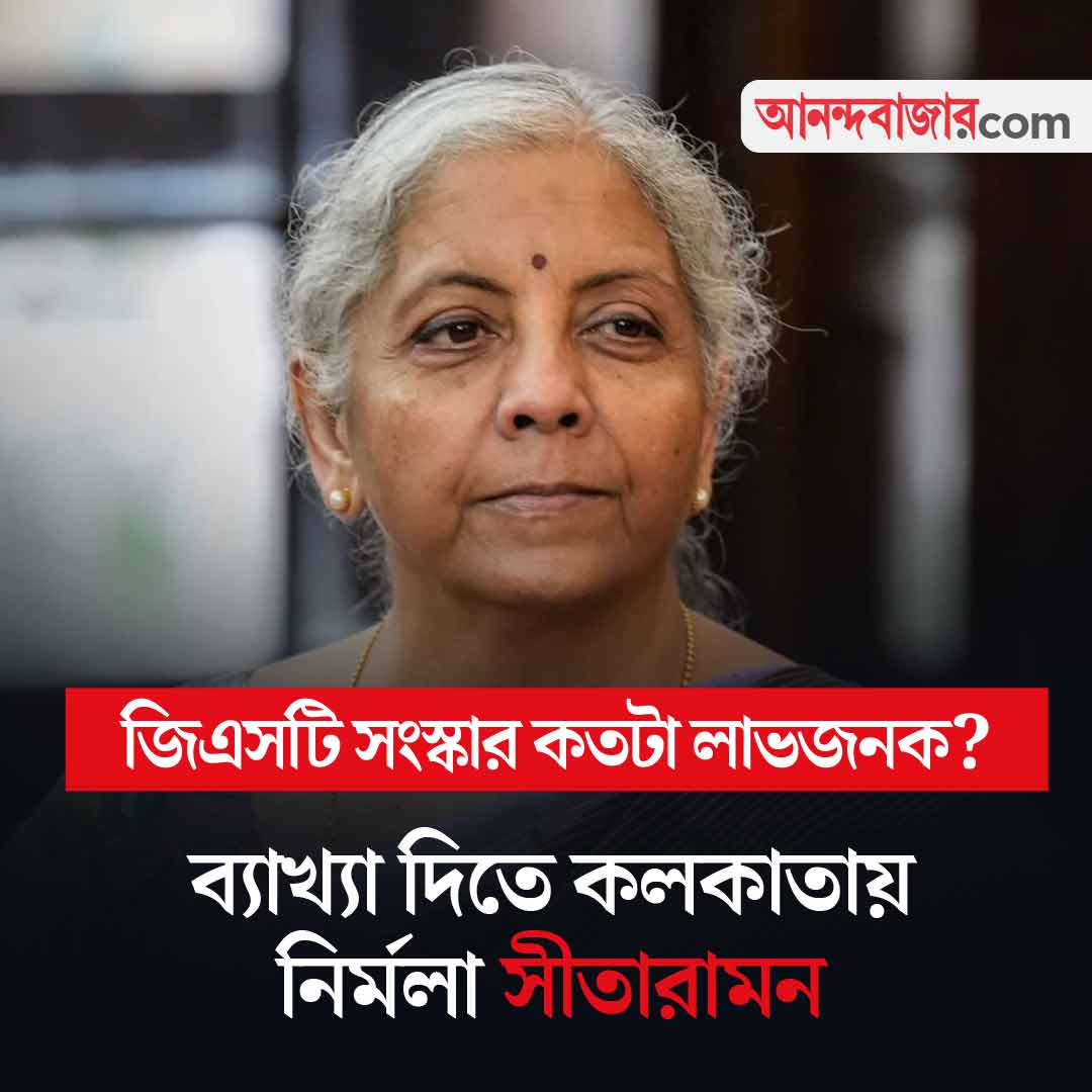 পণ্য ও পরিষেবা করের (জিএসটি) হারে সংস্কার আনা হয়েছে। আগে জিএসটির চারটি স্তর বা হার ছিল। তা পরিবর্তন করে দু’টি হার নির্দিষ্ট করা হয়েছে— ৫ শতাংশ এবং ১৮ শতাংশ। আগে এই দু’টি হারে কর নেওয়ার পাশাপাশি কিছু পণ্যের উপরে ১২ শতাংশ এবং ২৮ শতাংশ হারেও জিএসটি নেওয়া হত। সেই দু’টি স্তর (স্ল্যাব) লুপ্ত করা হয়েছে। করের এই নতুন হার কার্যকরী হচ্ছে আগামী ২২ সেপ্টেম্বর থেকে। তার আগে দেশের অর্থমন্ত্রী নির্মলা সীতারামন নিজেই কলকাতায় আসছেন জিএসটি সংস্কার সংক্রান্ত আলোচনায় অংশ নিতে। আজ জাতীয় গ্রন্থাগারের শ্যামাপ্রসাদ মুখোপাধ্যায় ভাষা ভবনের প্রেক্ষাগৃহে একটি আলোচনাসভা হবে। সেখানে ব্যবসায়ী ও উপভোক্তা-সহ বিভিন্ন শ্রেণির সামনে কেন্দ্রীয় অর্থমন্ত্রী ব্যাখ্যা করবেন, জিএসটির নতুন হারের তাৎপর্য কী এবং তাতে কোন কোন শ্রেণি কী ভাবে উপকৃত হবেন।