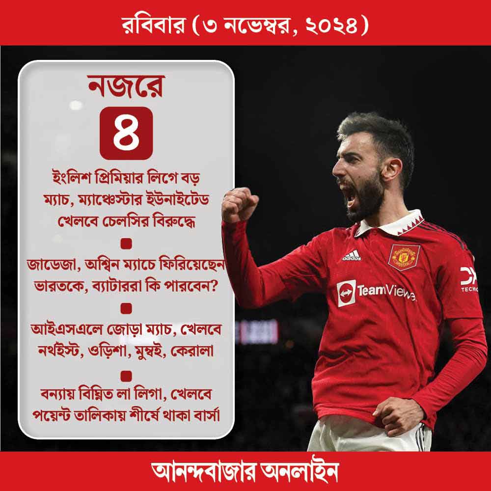 নতুন কোচ এসেছেন ম্যাঞ্চেস্টার ইউনাইটেডে। তবে রুবেন আমোরিমের প্রশিক্ষণে এখনই নামছে না ম্যান ইউ। তিনি দায়িত্ব নেবেন ১১ নভেম্বর থেকে। আজ ম্যাঞ্চেস্টার ইউনাইটেডের সামনে ইংলিশ প্রিমিয়ার লিগে কঠিন ম্যাচ। খেলতে হবে চেলসির বিরুদ্ধে। খেলা শুরু রাত ১০টা থেকে। তার আগে সন্ধ্যা ৭:৩০ থেকে রয়েছে টটেনহ্যাম বনাম অ্যাস্টন ভিলা ম্যাচ। খেলা দেখা যাবে স্টার স্পোর্টস চ্যানেল ও হটস্টার অ্যাপে।