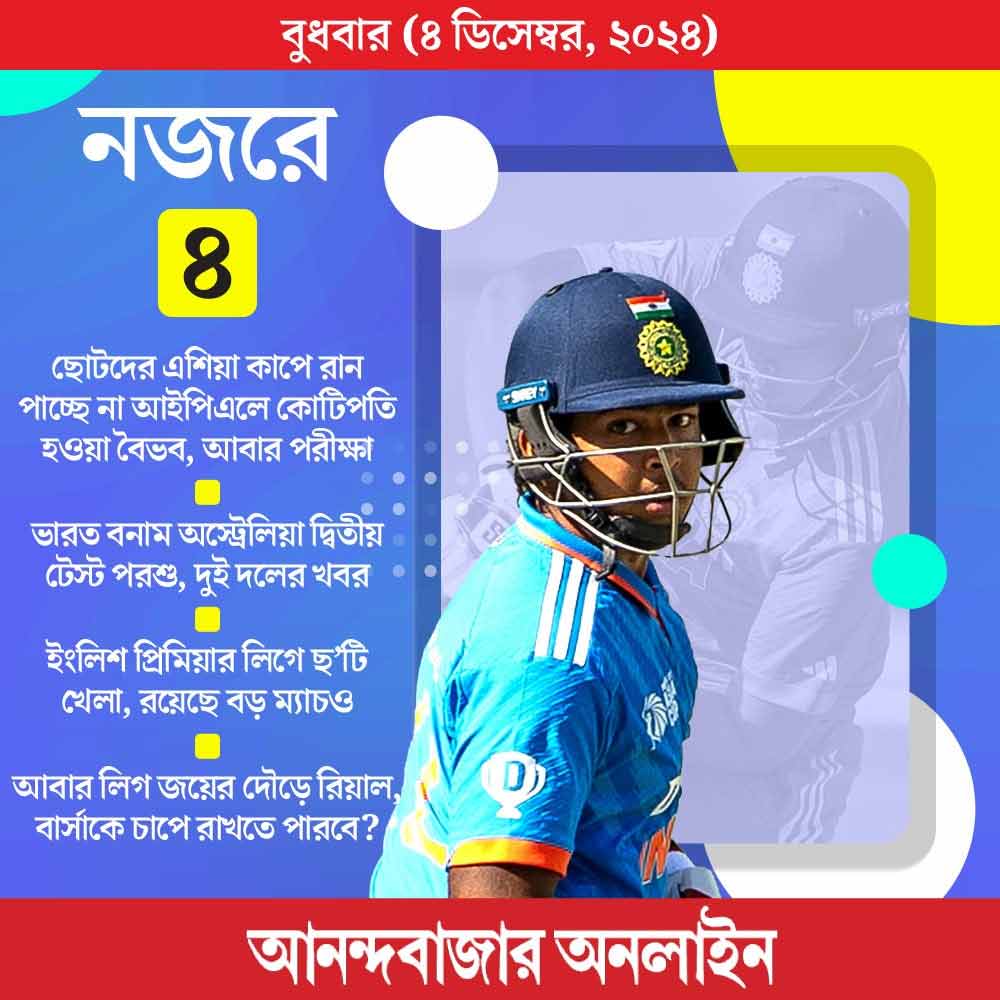 আজ আবার বৈভব সূর্যবংশীর পরীক্ষা। ১৩ বছর বয়সে কোটিপতি হয়ে যাওয়া বিহারের এই ক্রিকেটার দেশের জার্সিতে দু’টি ম্যাচে রান পায়নি। ছোটদের এশিয়া কাপে আজ ভারতের সামনে সংযুক্ত আরব আমিরশাহি। রান পাবে বৈভব? রয়েছে ইংলিশ প্রিমিয়ার লিগে পাঁচটি ম্যাচ, স্প্যানিশ লিগে বার্সেলোনার খেলা, আইএসএলের ম্যাচ।