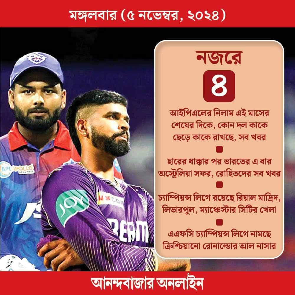 আইপিএলের রিটেনশন ঘোষণা হয়ে যেতেই নানা জল্পনা শুরু নিলাম নিয়ে। কোন দল কাকে নেওয়ার কথা ভাবছে? আইপিএলের বিভিন্ন দলের খবর। চ্যাম্পিয়ন্স লিগ ফুটবলে আজ ন’টি ম্যাচ। নামছে রিয়াল মাদ্রিদ, লিভারপুল, ম্যাঞ্চেস্টার সিটির মতো বড় দল। রয়েছে এএফসি চ্যাম্পিয়ন্স লিগে আল নাসারের খেলা।