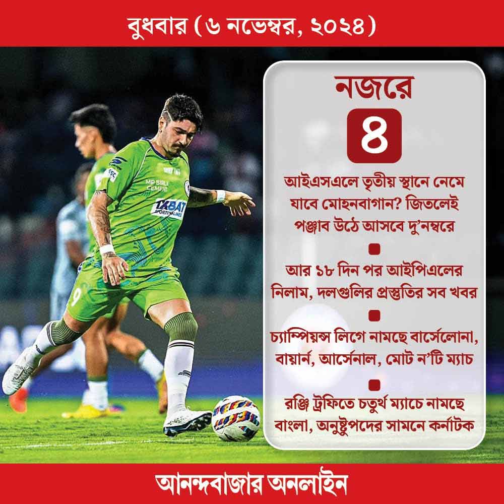 আইএসএলে রয়েছে পঞ্জাবের ম্যাচ। জিতলেই মোহনবাগানকে টপকে দ্বিতীয় স্থানে উঠে আসবে তারা। এ ছাড়া রয়েছে চ্যাম্পিয়ন্স লিগ ফুটবলের ন’টি ম্যাচ এবং বাংলার রঞ্জি ট্রফির খেলা।