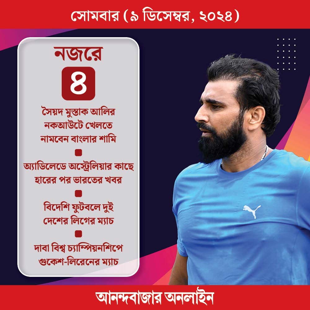 পার্থ টেস্টে জয় পাওয়ার পর অ্যাডিলেডে হেরে গিয়েছে ভারত। সিরিজ়ে সমতা ফিরেছে। ভারতীয় দলের লড়াই এ বার ব্রিসবেনে। হারের পর শিবিরের সব খবরের দিকে চোখ থাকবে। এ ছাড়া ক্রিকেটে রয়েছে বাংলার ম্যাচ। ফুটবল বিদেশি লিগ। চোখ থাকবে দাবা বিশ্ব চ্যাম্পিয়নশিপের দিকেও।