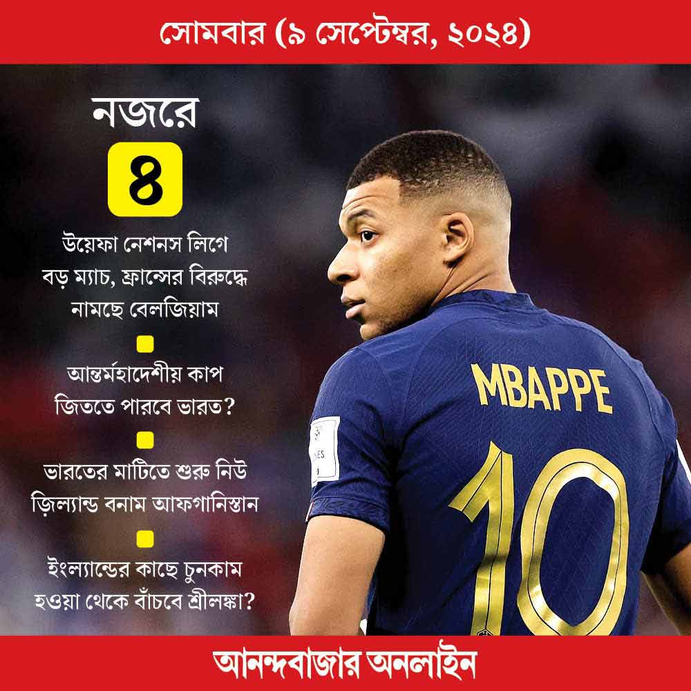 ইউরোপে দেশগুলি ফুটবলের লড়াই চলছে পুরোদমে। সোমবার রাতেও রয়েছে বেশ কিছু ম্যাচ। ঘরের মাঠে ফ্রান্স খেলতে নামবে বেলজিয়ামের বিরুদ্ধে। আগের ম্যাচে ইটালির কাছে হারার পর কিলিয়ান এমবাপেরা জয়ের মুখ দেখবেন? এ ছাড়াও রয়েছে তুরস্ক-আইসল্যান্ড, স্লোভেনিয়া-কাজাখস্তান, রোমানিয়া-লিথুয়ানিয়া, ইসরায়েল-ইটালি, নরওয়ে-অস্ট্রিয়া, মন্টেনেগ্রো-ওয়েলস ম্যাচ। সব ম্যাচ শুরু রাত ১২.১৫টায়। দেখা যাবে সোনি লিভ অ্যাপে।