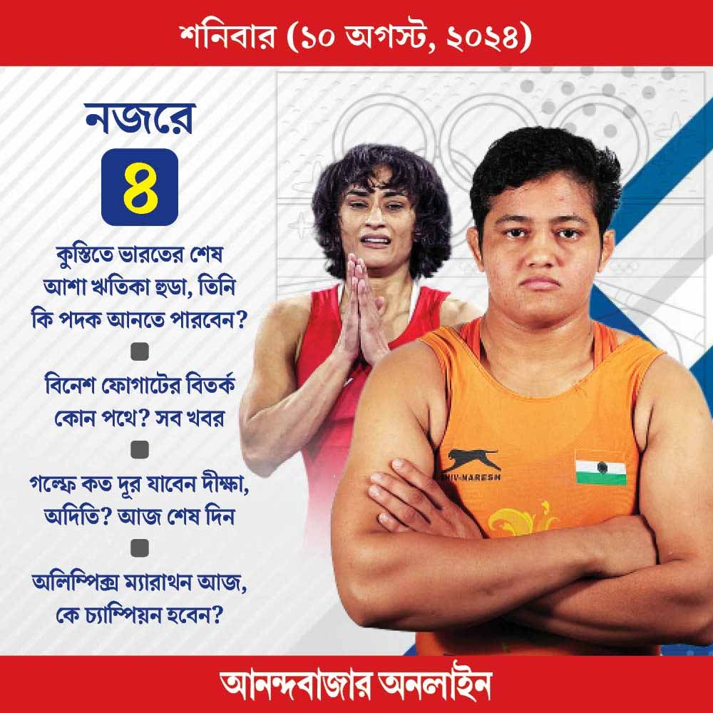 এ বারের অলিম্পিক্সে আজ ভারতের শেষ প্রতিনিধি হিসাবে নামছেন ঋতিকা হুডা। মহিলাদের কুস্তিতে ৭৬ কেজি বিভাগে নামছেন তিনি। চলছে মহিলাদের গল্ফ। প্রতিনিধিত্ব করছেন ভারতের দুই গল্ফার অদিতি অশোক এবং দীক্ষা দাগার। আজ অলিম্পিক্সের পুরুষদের ম্যারাথন। কলকাতা ফুটবল লিগে রয়েছে মহমেডানের খেলা।