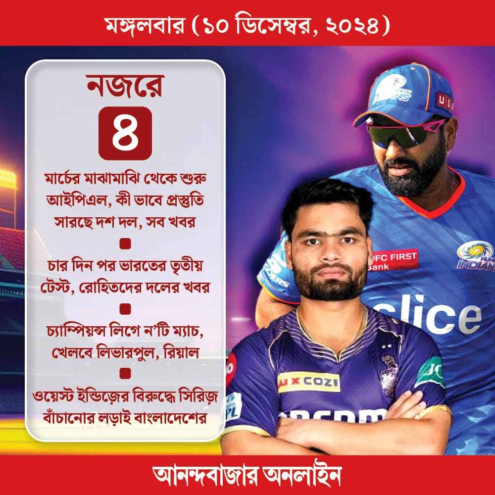 ১৪ মার্চ থেকে শুরু আইপিএল। বিভিন্ন দলের প্রস্তুতির সব খবর। চ্যাম্পিয়ন্স লিগ ফুটবলে আজ ন’টি ম্যাচ। খেলবে লিভারপুল, বায়ার্ন মিউনিখ, পিএসজি, রিয়াল মাদ্রিদ। রয়েছে ওয়েস্ট ইন্ডিজ় বনাম বাংলাদেশ এক দিনের ম্যাচ।