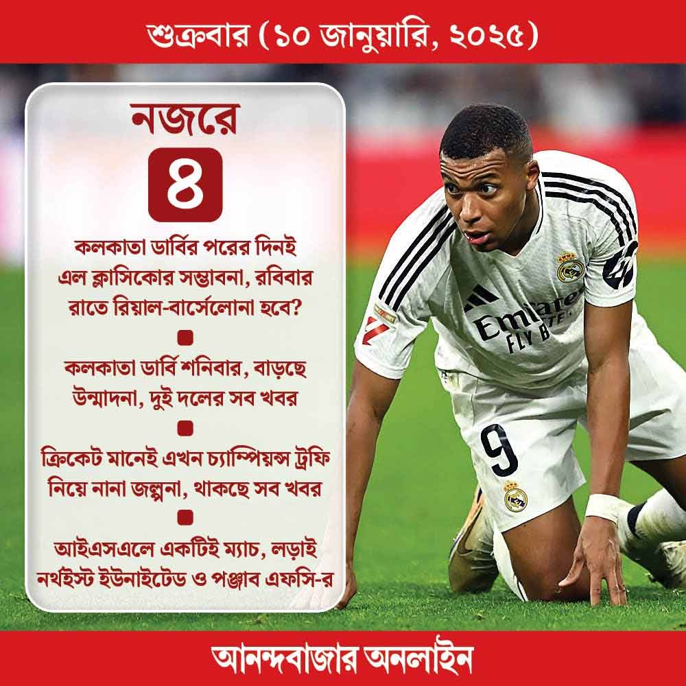 রবিবার হতে পারে এল ক্লাসিকো। অপেক্ষা রিয়াল মাদ্রিদের জয়ের। তা হলেই সুপারকোপার ফাইনালে মুখোমুখি হবে বার্সেলোনা ও রিয়াল মাদ্রিদ। ফুটবলপ্রেমীদের স্বপ্নপূরণ হবে? এ ছাড়াও থাকছে চ্যাম্পিয়ন্স ট্রফির খবর ও আইএসএলের ম্যাচ।