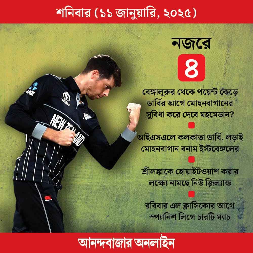 আইএসএলে আজ রয়েছে আরও একটি ম্যাচ। খেলবে মহমেডান-বেঙ্গালুরু। এই ম্যাচে বেঙ্গালুরু পয়েন্ট নষ্ট করলে ডার্বির আগে সুবিধা পাবে মোহনবাগান। রয়েছে নিউ জ়িল্যান্ড বনাম শ্রীলঙ্কা তৃতীয় এক দিনের ম্যাচ।