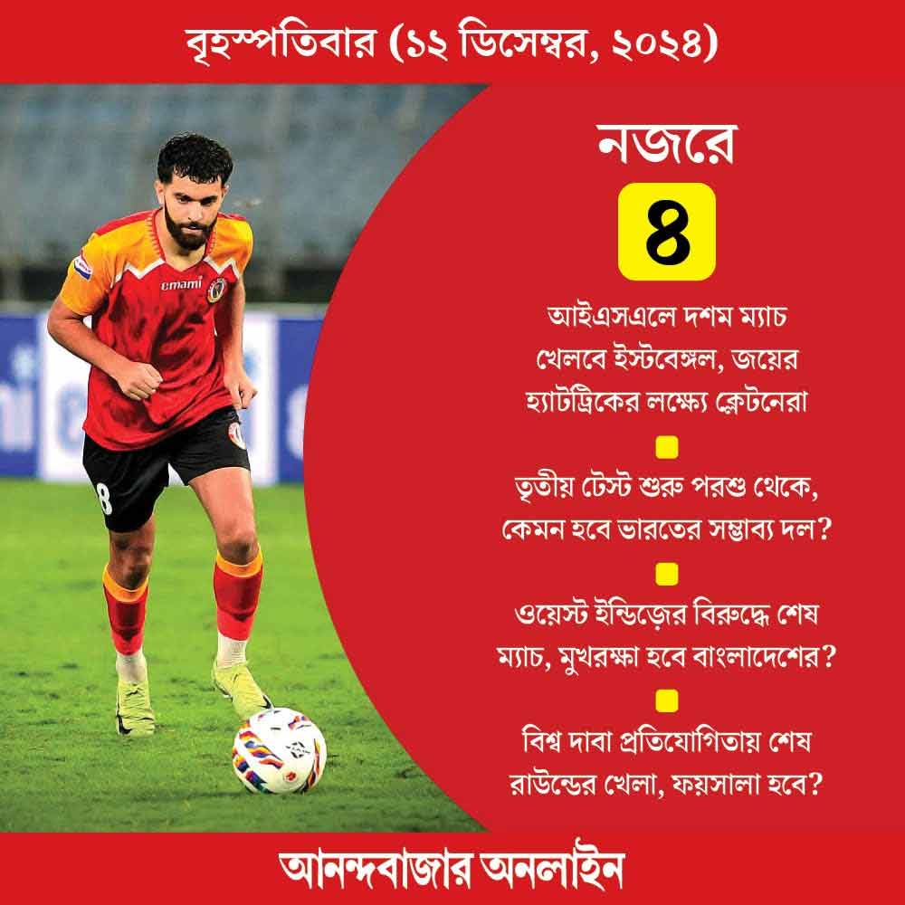 ভারত-অস্ট্রেলিয়া তৃতীয় টেস্ট শুরু পরশু থেকে। কেমন হতে পারে ভারতীয় দল? টেস্ট শুরুর আগে দুই দলের সব খবর। আইএসএলে আজ জয়ের হ্যাটট্রিক করার লক্ষ্যে নামছে ইস্টবেঙ্গল। যুবভারতীতে লাল-হলুদের বিপক্ষে ওড়িশা। রয়েছে বাংলাদেশ বনাম ওয়েস্ট ইন্ডিজ শেষ এক দিনের ম্যাচ এবং বিশ্ব দাবা প্রতিযোগিতায় শেষ রাউন্ডের খেলা।