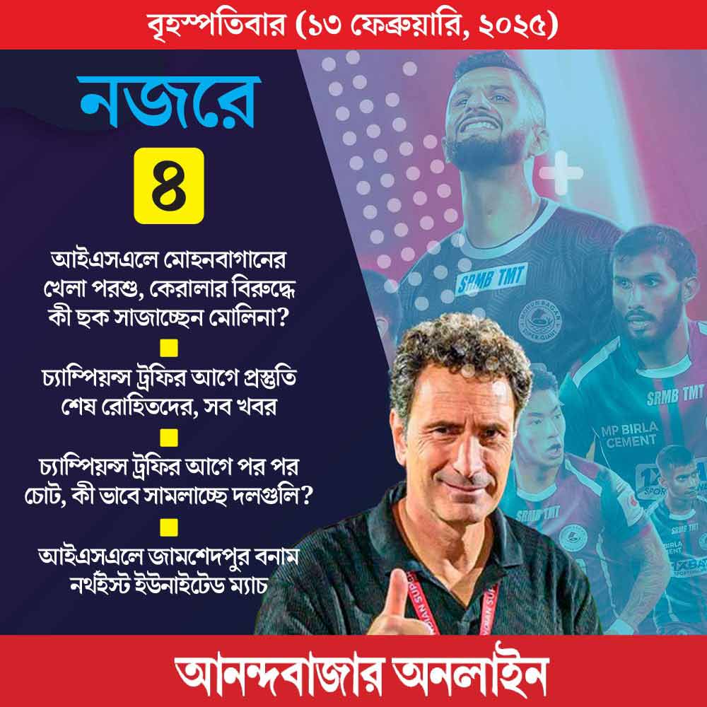 শনিবার আইএসএলে মোহনবাগানের খেলা। ২০ ম্যাচে ৪৬ পয়েন্ট নিয়ে তালিকায় শীর্ষে রয়েছে সবুজ-মেরুন। কেরালা ব্লাস্টার্সের বিরুদ্ধে নামার আগে কী বলছেন কোচ হোসে মোলিনা? এ ছাড়াও থাকছে চ্যাম্পিয়ন্স ট্রফির খবর, আইএসএলের ম্যাচ।