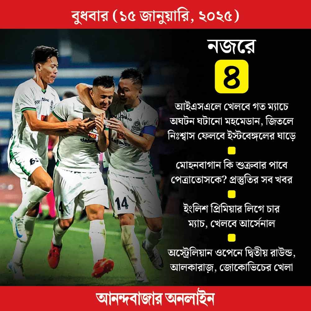 আইএসএলে আজ আবার নামছে মহমেডান। ঘরের মাঠে তাদের প্রতিপক্ষ চেন্নাইয়িন। আগের ম্যাচে বেঙ্গালুরুকে তাদের মাঠে গিয়ে হারিয়ে অঘটন ঘটানো মহমেডান আজ জিততে পারবে? এ ছাড়াও রয়েছে ইংলিশ প্রিমিয়ার লিগের চারটি ম্যাচ, বিজয় হজারে ট্রফির সেমিফাইনাল, ভারত-আয়ারল্যান্ড মহিলাদের এক দিনের ম্যাচ।