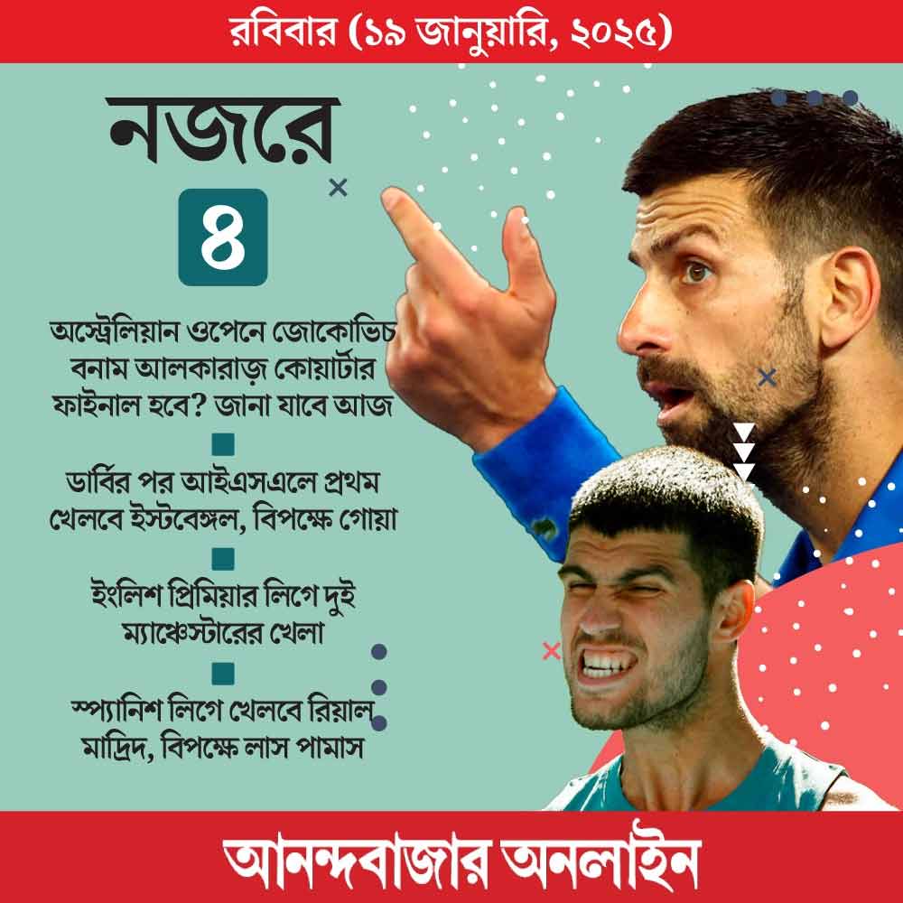 অস্ট্রেলিয়ান ওপেনে আজ প্রি-কোয়ার্টার ফাইনালের খেলা। খেলবেন নোভাক জোকোভিচ, কার্লোস আলকারাজ়, আলেকজান্ডার জ়েরেভ। জানা যাবে কোয়ার্টার ফাইনালে জোকোভিচ-আলকারাজ় লড়াই হবে কি না। রয়েছে ইংলিশ প্রিমিয়ার লিগে দুই ম্যাঞ্চেস্টারের খেলা, স্প্যানিশ লিগে রিয়ালের ম্যাচ, মেয়েদের এশিয়া কাপে ভারতের খেলা।