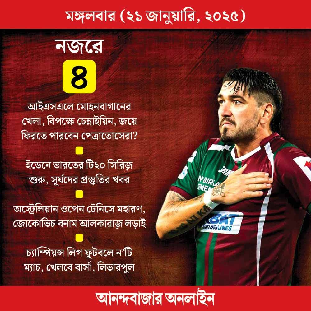 আইএসএলে আজ আবার খেলবে মোহনবাগান। বিপক্ষে চেন্নাইয়িন এফসি। জয়ে ফেরার লক্ষ্যে নামবে সবুজ-মেরুন। রয়েছে অস্ট্রেলিয়ান ওপেনে জোকোভিচ-আলকারাজ় কোয়ার্টার ফাইনাল, চ্যাম্পিয়ন্স লিগ ফুটবলে বার্সেলোনা, লিভারপুলের খেলা।