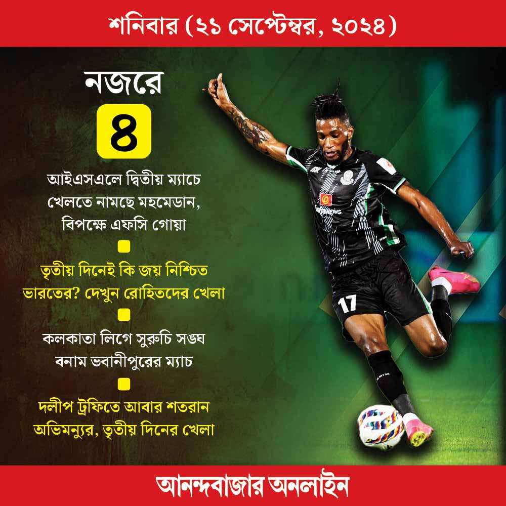৩০৮ রানে এগিয়ে রোহিত শর্মার ভারত। হাতে ৭ উইকেট। আজই কি জয় নিশ্চিত হয়ে যাবে? আজ তৃতীয় দিনের খেলা। আইএসএলে দ্বিতীয় ম্যাচে খেলতে নামছে মহমেডান। কলকাতা লিগে রয়েছে সুরুচি সঙ্ঘ বনাম ভবানীপুর ম্যাচ। দলীপ ট্রফিতে জোড়া ম্যাচ। বিদেশের ফুটবল লিগে চেলসি, লিভারপুল, ম্যাঞ্চেস্টার ইউনাইটেড, রিয়াল মাদ্রিদের ম্যাচ।