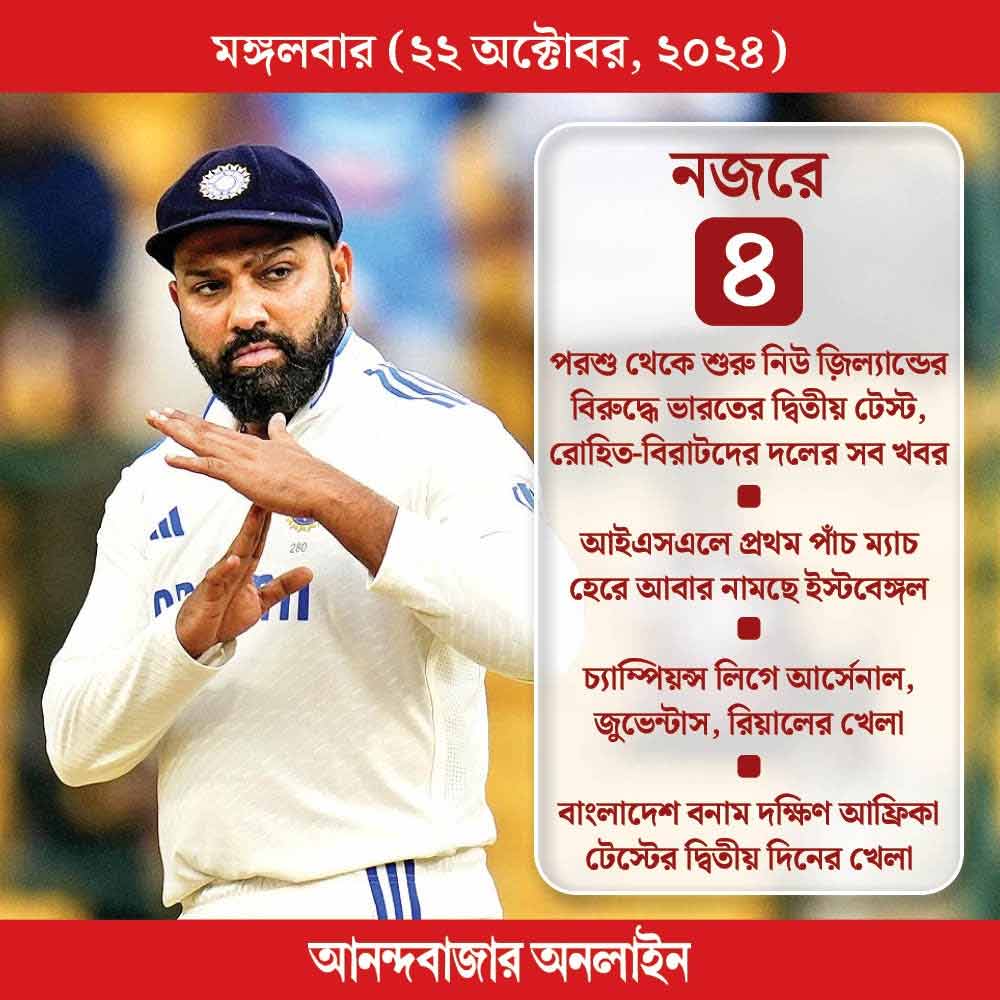 বৃহস্পতিবার থেকে শুরু হচ্ছে নিউ জ়িল্যান্ডের বিরুদ্ধে ভারতের দ্বিতীয় টেস্ট। তার আগে ভারতীয় দলের সব খবর। আবার শুরু হচ্ছে চ্যাম্পিয়ন্স লিগ ফুটবল। রয়েছে ন’টি ম্যাচ। খেলবে আর্সেনাল, জুভেন্টাস, রিয়াল মাদ্রিদ। রয়েছে বাংলাদেশ বনাম দক্ষিণ আফ্রিকা টেস্টের দ্বিতীয় দিনের খেলা।