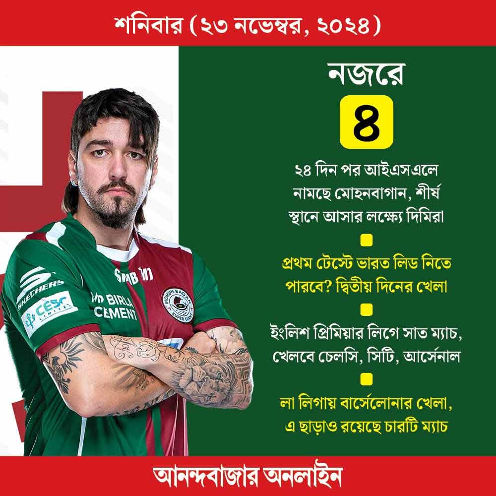 আইএসএলে ২৪ দিন পর আজ নামছে মোহনবাগান। যুবভারতীতে খেলা জামশেদপুর এফসির বিরুদ্ধে। জিতলে শীর্ষ স্থানে চলে আসবে সবুজ-মেরুন। রয়েছে ইংলিশ প্রিমিয়ার লিগে চেলসি, ম্যাঞ্চেস্টার সিটি, আর্সেনালের খেলা, স্প্যানিশ লিগে বার্সেলোনার ম্যাচ।