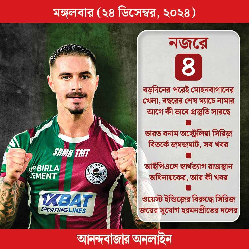 বড়দিনের পরেই আইএসএলে নামছে মোহনবাগান। গত ম্যাচে এফসি গোয়ার কাছে অ্যাওয়ে ম্যাচে হারতে হয়েছে সবুজ-মেরুনকে। এ বার দিল্লিতে খেলতে হবে পঞ্জাব এফসি-র সঙ্গে। থাকছে আইপিএলের খবর, ভারত-ওয়েস্ট ইন্ডিজ মেয়েদের এক দিনের ম্যাচ।