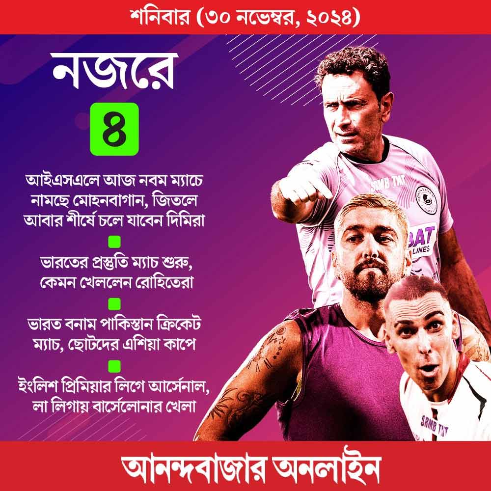 আইএসএলে আজ আবার নামছে মোহনবাগান। যুবভারতীতে সবুজ-মেরুনের সামনে চেন্নাইয়িন। জিতলেই পয়েন্ট তালিকায় আবার শীর্ষে চলে যাবে দিমিত্রি পেত্রাতোস, জেসন কামিংসের দল। আজ ছোটদের এশিয়া কাপ ক্রিকেটে ভারত-পাকিস্তান মহারণ। এই ম্যাচ দিয়েই অভিযান শুরু করছে দুই দেশ। রয়েছে ইংলিশ প্রিমিয়ার লিগে আর্সেনাল ও স্প্যানিশ লিগে বার্সেলোনার খেলা।