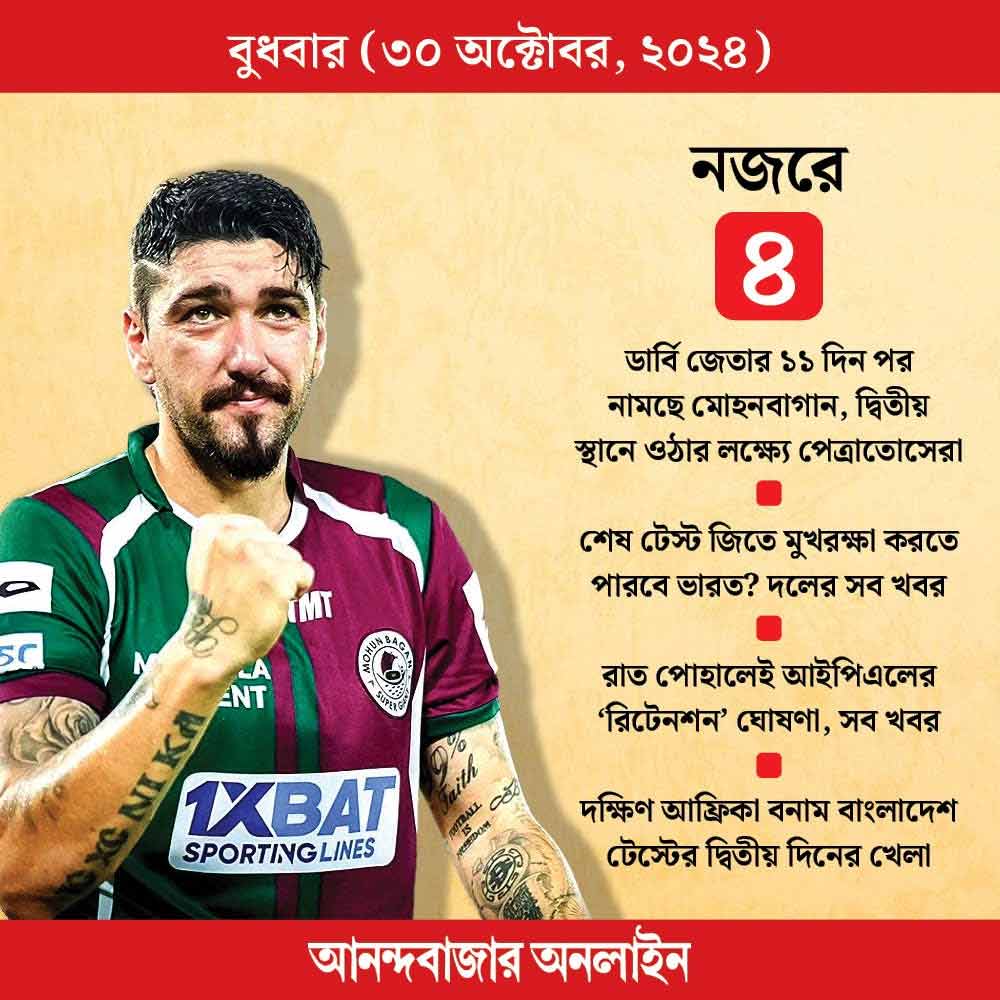পরশু থেকে শুরু হচ্ছে নিউ জ়িল্যান্ডের বিরুদ্ধে ভারতের তৃতীয় টেস্ট। প্রথম দু’টি ম্যাচ হেরে ইতিমধ্যেই সিরিজ় হেরেছে রোহিত শর্মার দল। দীর্ঘ ১২ বছর পর ঘরের মাঠে টেস্ট সিরিজ় হেরেছে ভারত। শেষ টেস্টে জিতে কিছুটা মুখরক্ষা করতে পারবেন রোহিতেরা? ভারতীয় দলের সব খবর। আইএসএলে ১১ দিন পর আজ আবার নামছে মোহনবাগান। হায়দরাবাদ এফসিকে হারালে দিমিত্রি পেত্রাতোসেরা দ্বিতীয় স্থানে উঠে আসবেন। থাকছে আইপিএলের খবর।