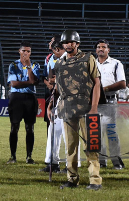 মাঠে তখন হাতে গোনা গুটিকয় পুলিশ। মাঠের মাঝেই দু’দলের প্লেয়ার ও রেফারিদের নিয়ে দাঁড়িয়ে থাকে পুলিশ। এর মধ্যেই হঠাৎ কোনও অজ্ঞাত কারণে খুলে যায় একটি গ্যালারির মাঠ মুখি গেট। সেখান দিয়েই পিল পিল করে মাঠে ঢুকে পড়তে শুরু করে উত্তেজিত মোহনবাগান সমর্থকরা। যাদের আটকানোর মতো সামর্থ সেই সময় পুলিশের ছিল না। ডেকে পাঠানো হয় পুলিশ ফোর্স। পুলিশ ফোর্স আসতে বেশি সময় না নিলেও ততক্ষণে পুরো গ্যালারি রীতিমতো মারমুখি। অনেক বাগান কর্তাকেও দেখা যায় গ্যালারি তাতাতে। পুলিশ ফোর্স এসেও সেই গ্যালারিকে শান্ত করতে পারেনি। মাঠে নামেন স্বয়ং মোহনবাগান সভাপতি টুটু বসু। তার মধ্যেই পুলিশকে ঘিরে শুরু হয় সমর্থকদের প্রতিবাদ। ম্যাচ শুরু করানোর চেষ্টায় নামে পুলিশ। কিন্তু সেগুড়েও বালি। সমর্থকদের বাগে আনতে অক্ষম পুলিশকে দেখা যায় দর্শকের ভূমিকায়। দেড় ঘন্টা পর মোহনবাগান মাঠে এসে পৌঁছয় ঘোর সওয়ার পুলিশ। তখনও মাঠে আটকে রেফারিরা। ততক্ষণে মাঠ থেকে বের করে নিয়ে যাওয়া হয়েছে দুই দলের ফুটবলারদের। শেষ পর্যন্ত গ্যালারি ফাঁকা যতক্ষণে হল ততক্ষণে পেড়িয়ে গিয়েছে অনেকটা সময়। সমর্থকরাই ক্লান্ত হয়ে ছেড়েছেন মাঠ। ম্যাচ বাতিল ঘোষণা করে দিয়েছে রেফারি। কিন্তু রেফারিকে বের করতে ঢাল নিয়ে মাঠে নামতে হয় পুলিশকে। ফাঁকা করে দেওয়া হয় মাঠের বাইরে দাঁড়িয়ে থাকা সমর্থকদের। শেষ পর্যন্ত র্যাফ নামিয়ে রেফারিদের মাঠ থেকে বের করে আনা হয়।